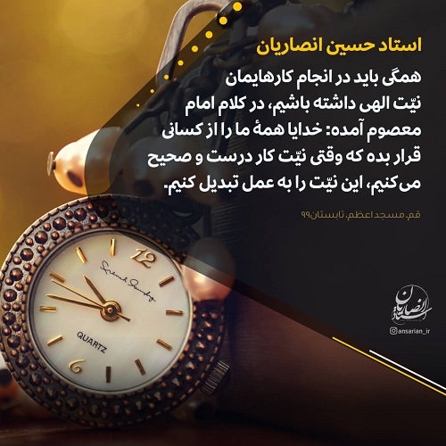 همگی باید در انجام کارهایمان نیّت الهی داشته باشیم، در کلام امام معصوم آمده: خدایا همهٔ ما را از کسانی قرار بده که وقتی نیّت کار درست و صحیح میکنیم، این نیّت را به عمل تبدیل کنیم.