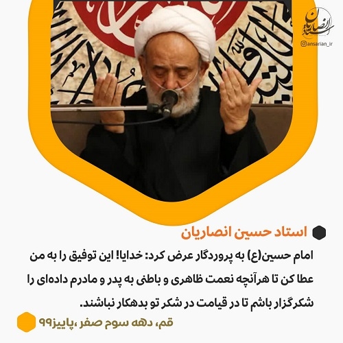 امام حسین(ع) به پروردگار عرض کرد: خدایا! این توفیق را به من عطا کن تا هرآنچه نعمت ظاهری و باطنی به پدر و مادرم دادهای را شکرگزار باشم تا در قیامت در شکر تو بدهکار نباشند.